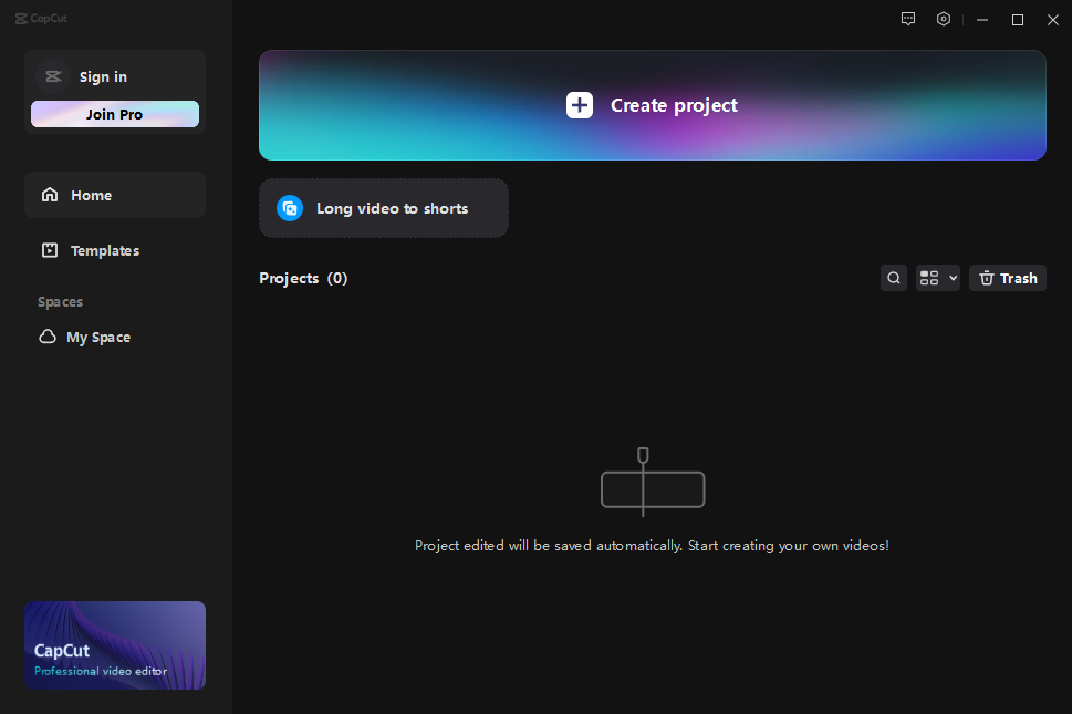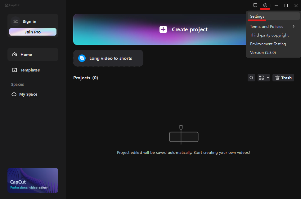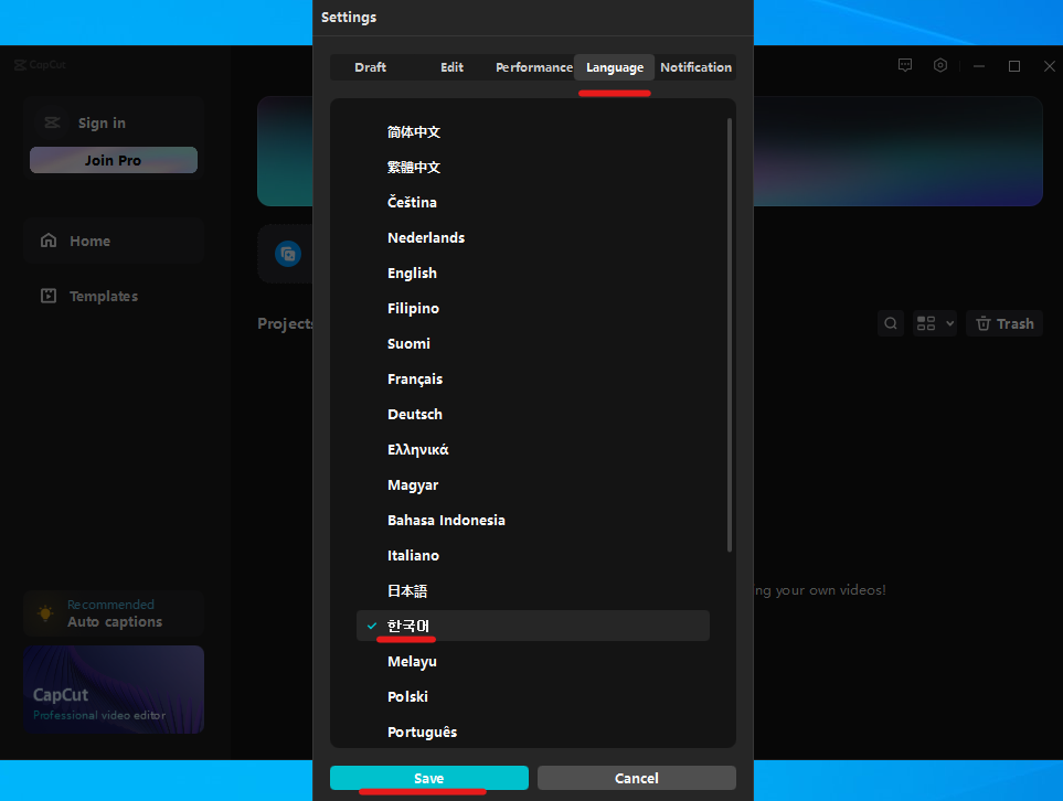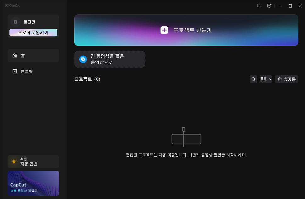 4. 캡컷을 재시작하면 아래 사진과 같이 언어가 한국어로 변경됩니다.