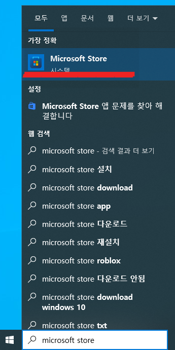 아래 사진과 같이 윈도우 키를 클릭하고 'Microsoft Store' 를 입력하고 클릭합니다.