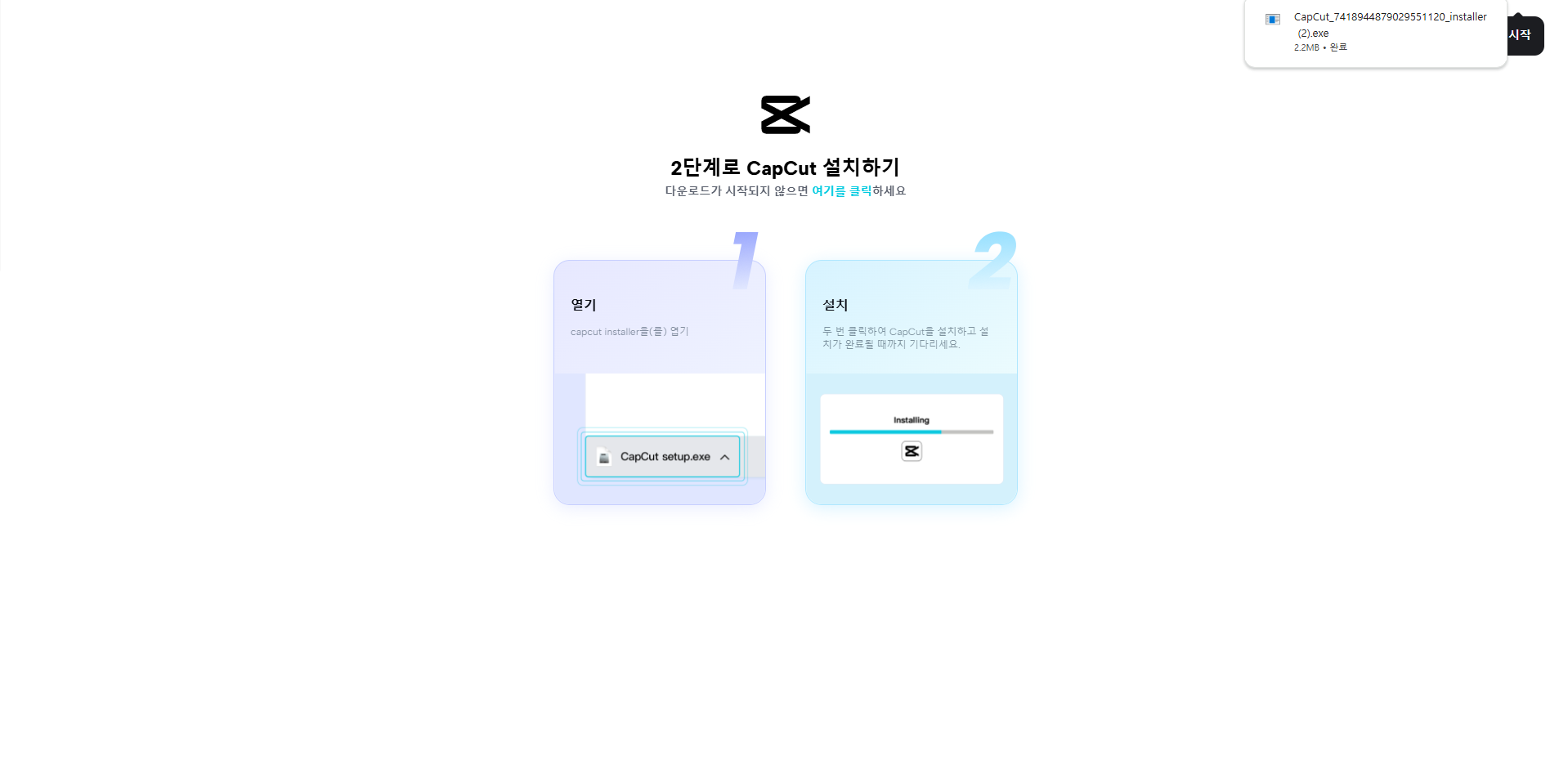 4. 우측 상단에 뜨는 설치 프로그램을 클릭하면 본격적인 캡컷 프로그램 다운로드가 시작됩니다.