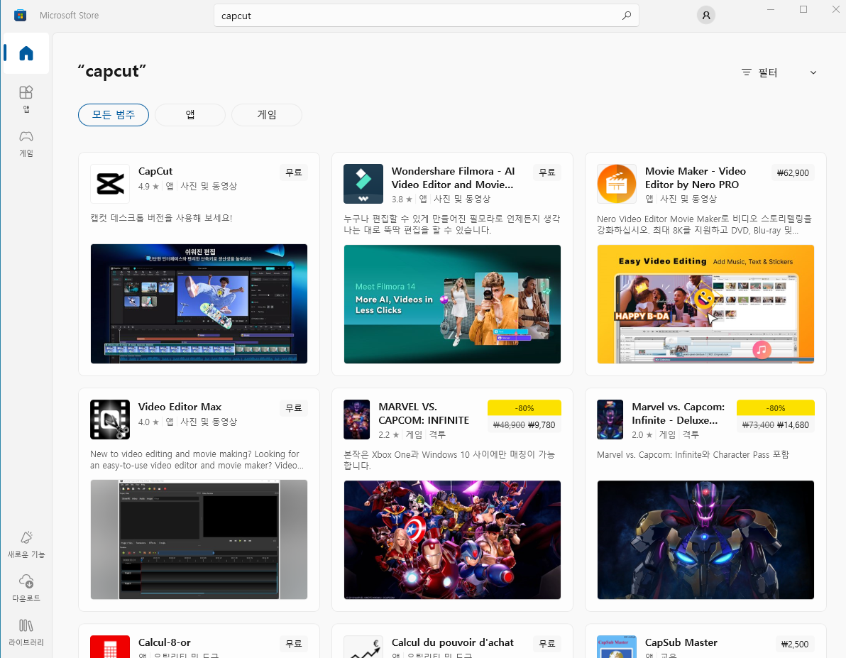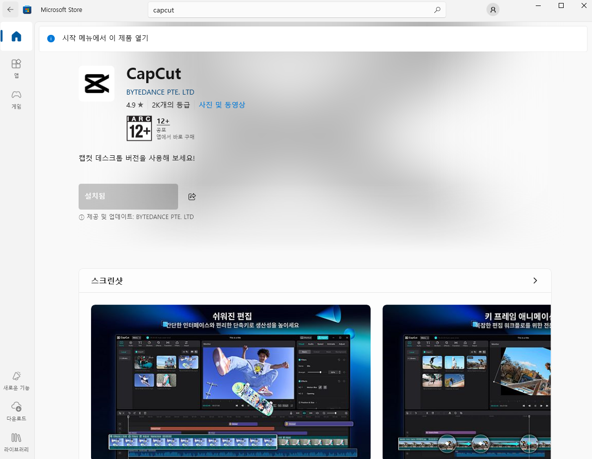 하지만 컴퓨터를 재시작 해도 다운이 되지 않는 다면 '마이크로소프트 스토어' 에서 캡컷을 다운받을 수 있습니다.
